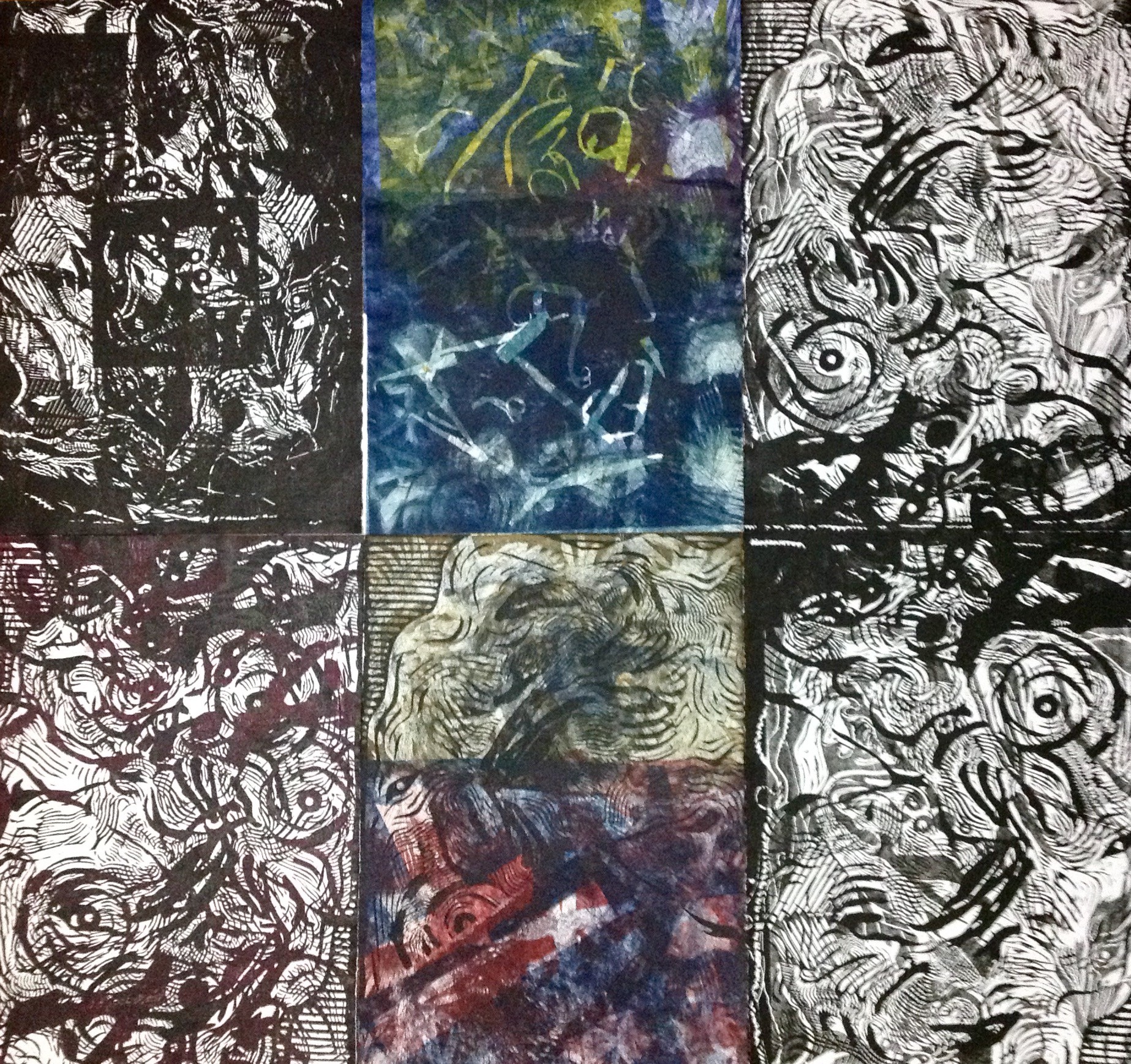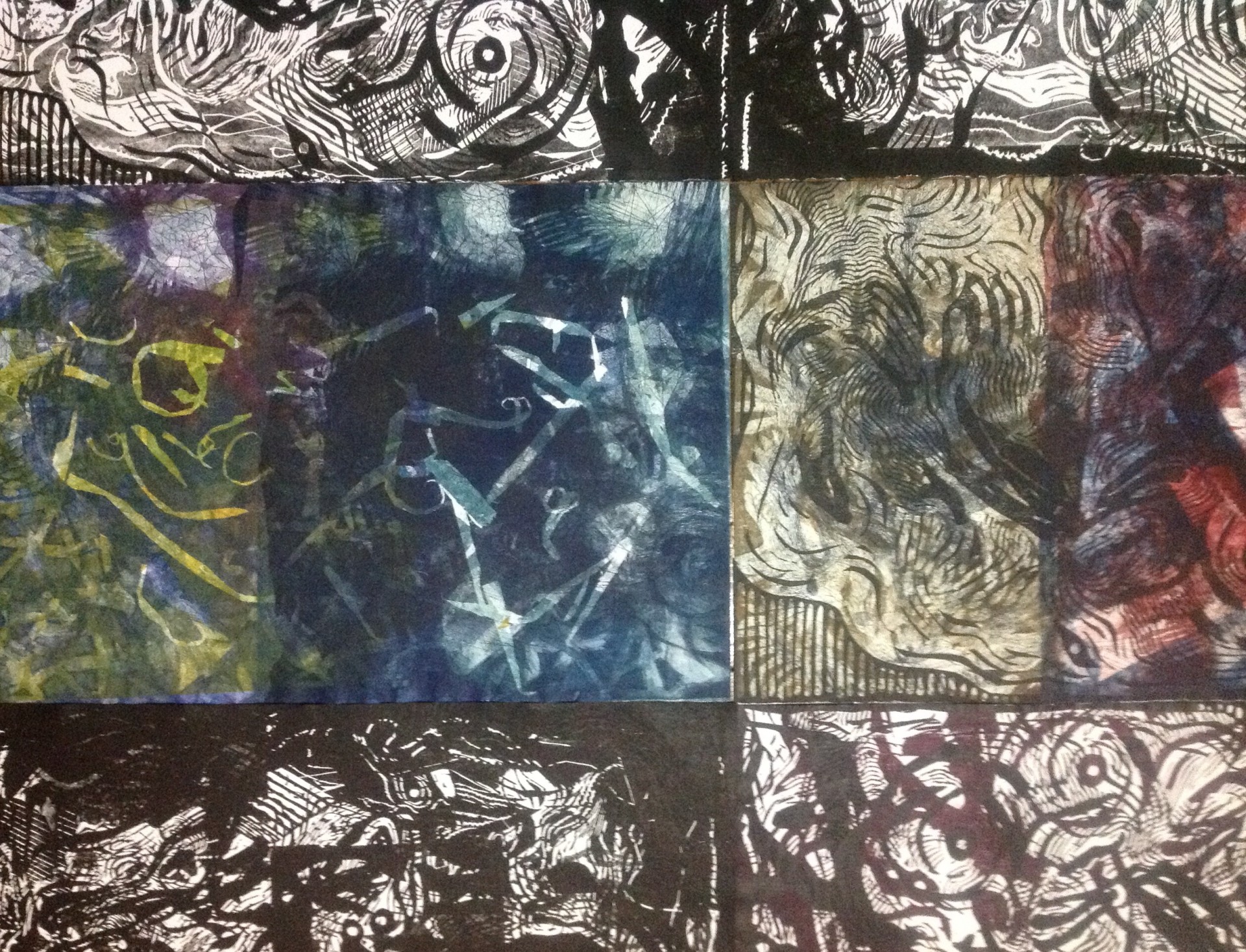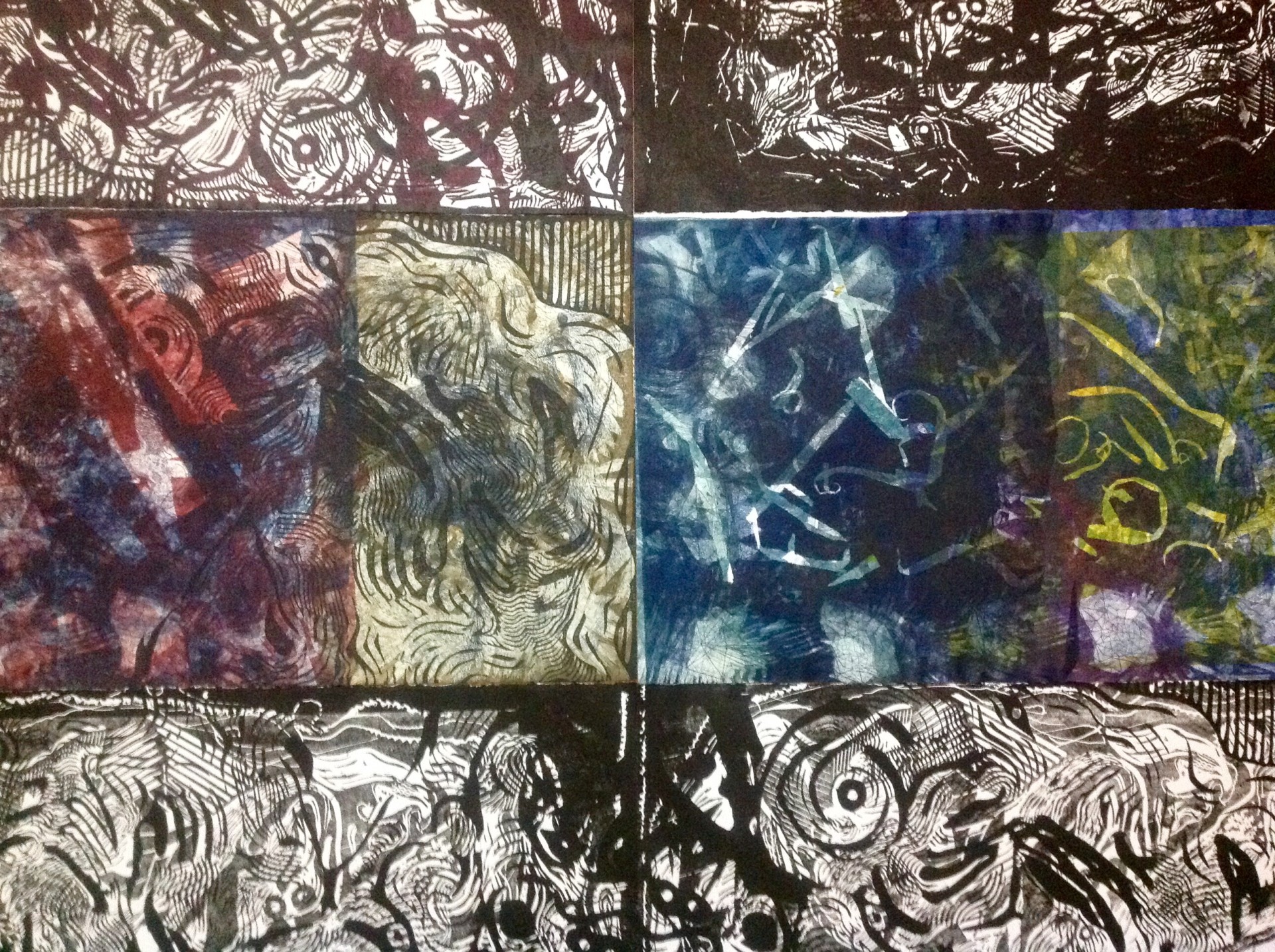 Pannello composto da stampe xilografiche realizzate in più matrici e colori. Dimensioni: 210x100 cm • xilografia mostre •