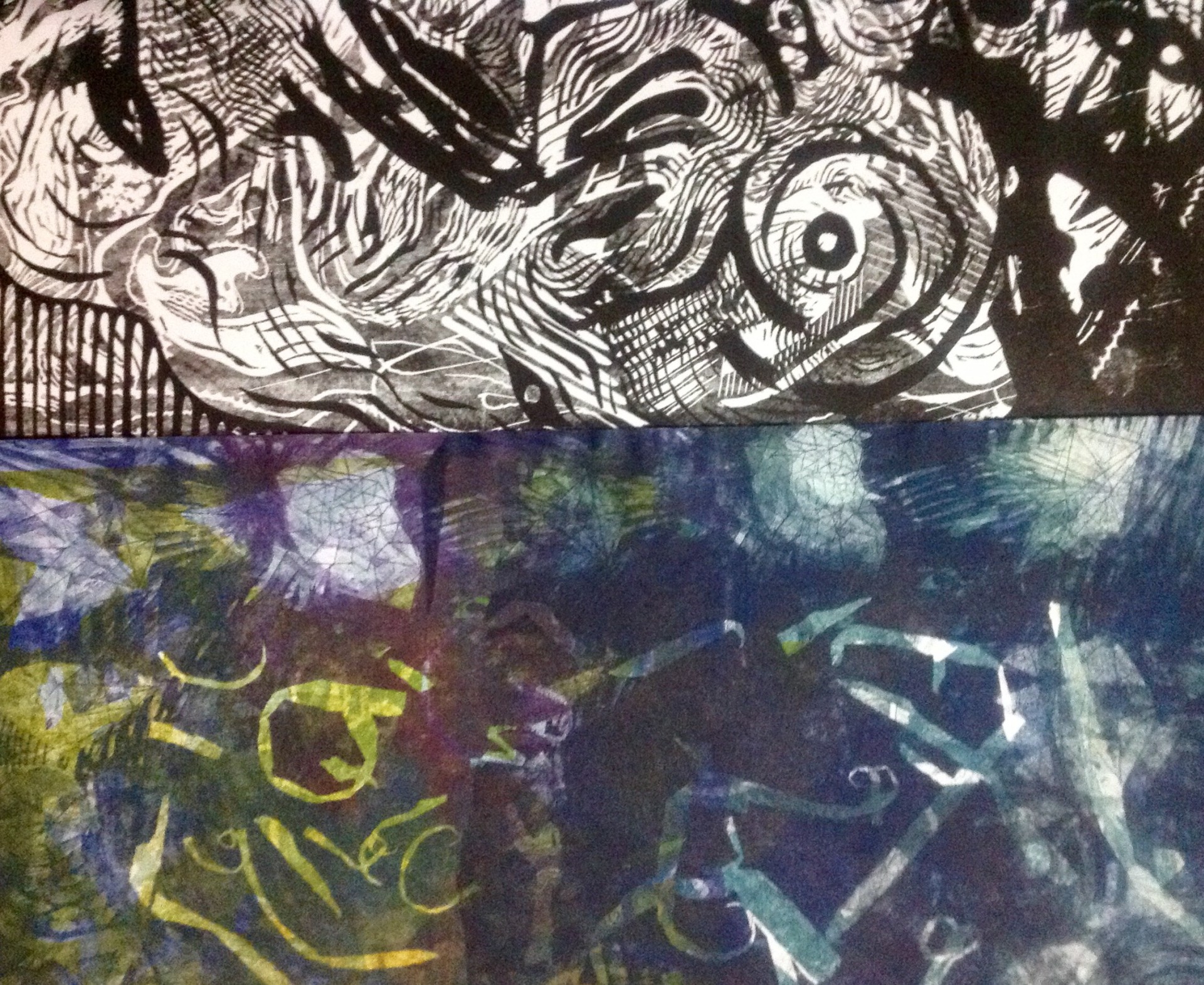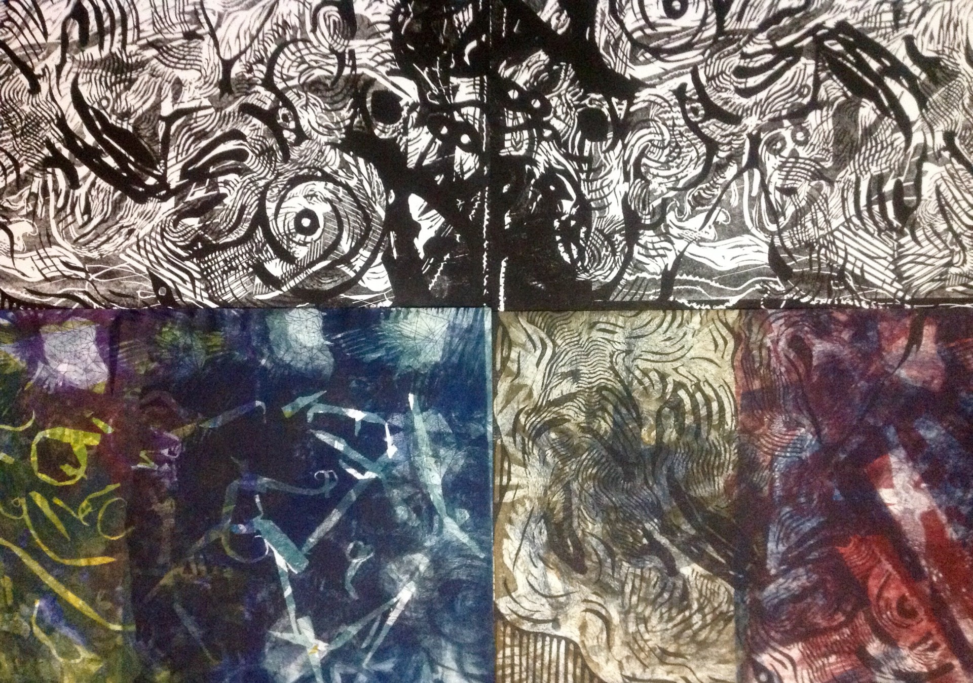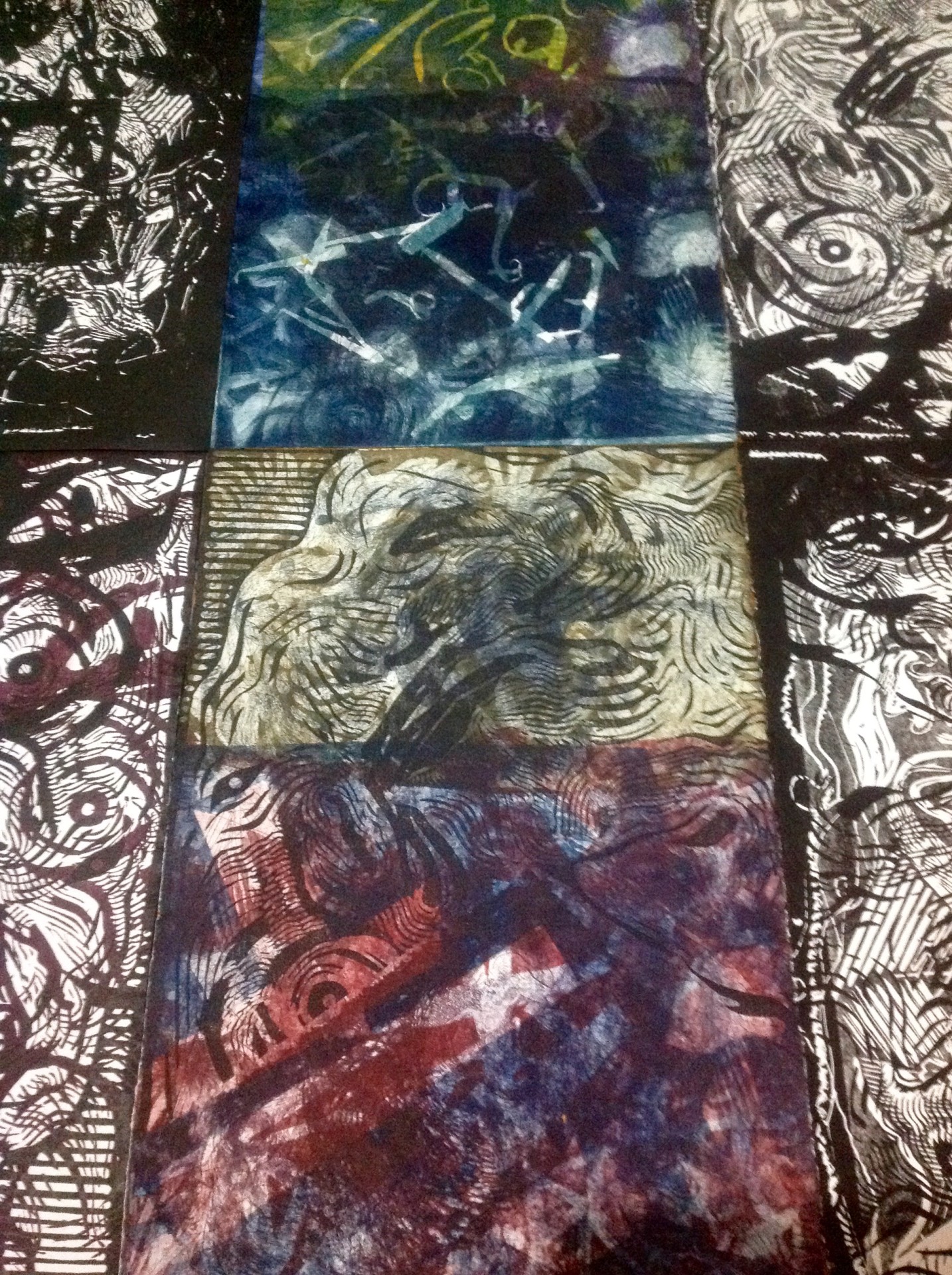 Pannello composto da stampe xilografiche realizzate in più matrici e colori. Dimensioni: 210x100 cm • xilografia mostre •